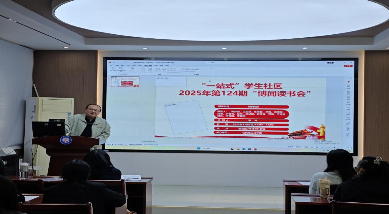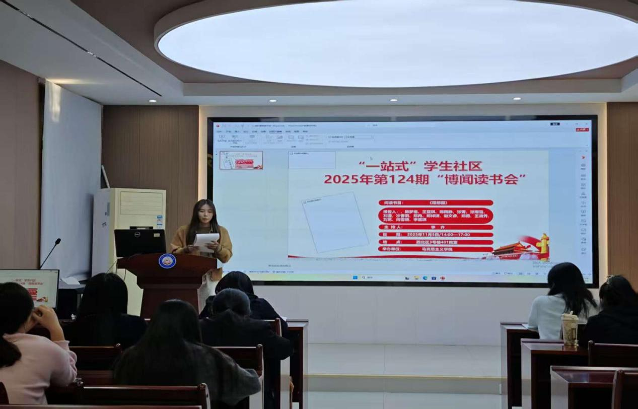 本网讯(通讯员:张潇、杨秀)11月5号下午,我院“一站式”社区第124期“博闻读书会”在马克思主义学院求是楼112报告厅顺利召开。本次读书会以《理想国》的理想为主题,围绕着柏拉图的著作《理想国》展开讨论。本次读书会由李齐老师主持。参加此次读书会的2025级15位研究生主讲人为韩梦格、王亚琪、陈雨静、张菁、张雨雪、刘滢、沙香羽、郑冉、郑倬捷、赵文睿、郑薇、王清秀、刘艺、闫雪晴、李嘉琪。院“博闻读书会”学术活动工作小组组织了此次读书会。