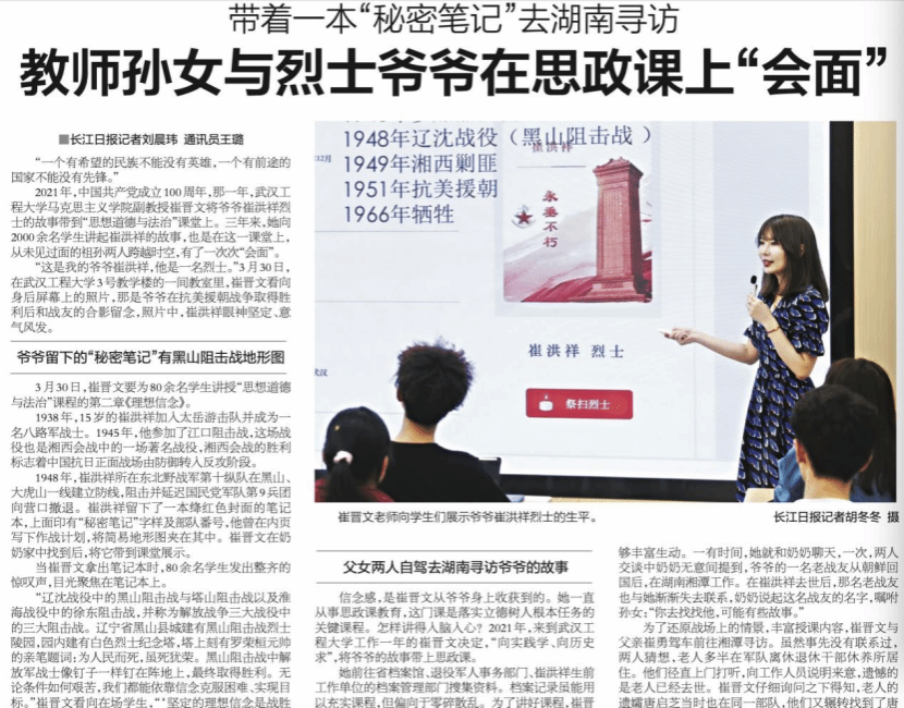 长江日报头版头条报道崔晋文讲爷爷的故事