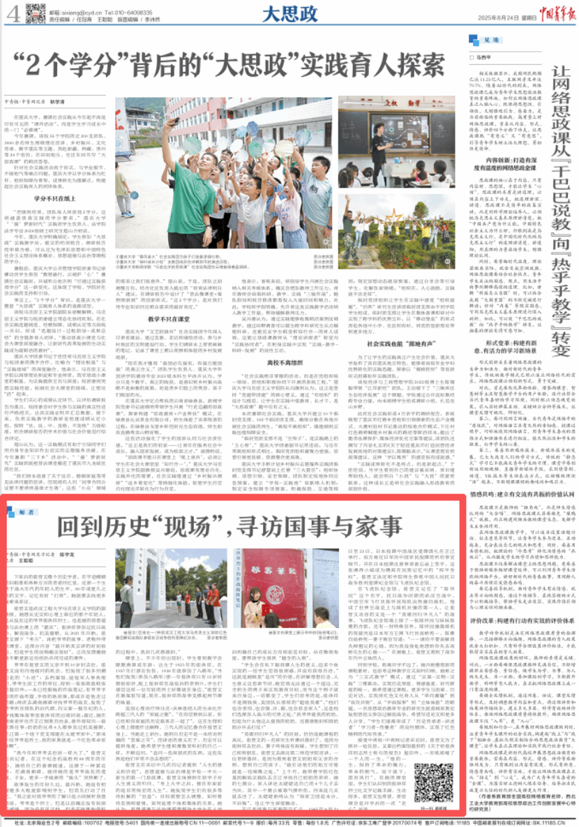 那枚功章再次被包裹起来,等待下一次课的开启。但它点亮的光芒早已穿透课本,照进了许多年轻人的心里。它不是结束,而是无数个旅程的开始。“历史不是一本结论明确的‘答案之书’,但它能为学生提供思考的角度。”崔晋文表示,她将继续整理新素材、新感悟,让“行走的思政课”不断延伸,帮助更多学生在与祖辈、历史的对话中,明确成长方向、树立人生目标,培育健全人格,让红色基因在青春的血脉中代代相传。