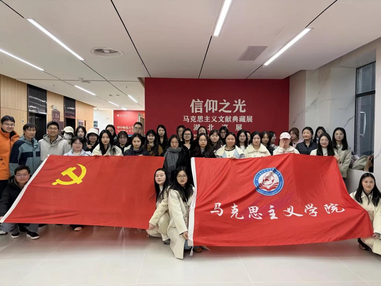 本网讯(通讯员:陈俊鹏 杨馥菡)为深入学习贯彻习近平新时代中国特色社会主义思想,强化学生党员的理论武装与党性修养,2025年11月17日上午,武汉工程大学马克思主义学院党委副书记蔡明广老师带队,组织学院研究生党员赴华中师范大学马克思主义学院参观“信仰之光——马克思主义文献典藏展”湖北巡展。